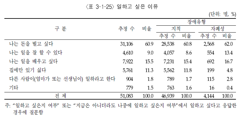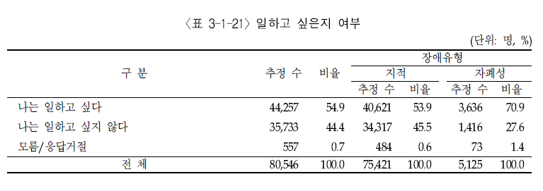 발달장애인이 일하고 싶지 않기 때문일까요? 그렇지 않습니다. 발달장애인 미취업자 70%를 대상으로 조사한 결과, 절반 이상이 ‘일하고 싶다’고 대답했습니다. 일하고 싶어도 할 수 없는 현 상황이 그대로 드러나 있습니다. 그렇다면 이들이 일하고 싶은 이유는 뭘까요?