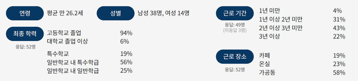 푸르메소셜팜·무이숲의 사회적 성과 측정을 위해 장애인 직원 52명을 대상으로 설문조사가 진행됐습니다. 2022년 한국장애인고용공단 고용개발원이 만 15세 이상 발달장애인 3,000명을 대상으로 조사한 <발달장애인 일과 삶 실태조사>와 비교해 장애직원의 특성 및 만족도 평가 결과를 도출했습니다. 그 전에 <발달장애인 일과 삶 실태조사> 중 장애인 취업 관련한 의미 있는 데이터들이 있어 먼저 소개합니다.