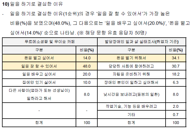 이 표는 일하기로 결심한 이유에 대한 답변입니다. 푸르메소셜팜과 무이숲 직원들은 ‘일을 잘 할 수 있어서’라는 답변이 압도적입니다. 반면 앞서 미리 살펴봤듯이 발달장애인 취업자 통계에는 ‘돈을 벌기 위해서’가 1위를 차지하고 있지요. 푸르메소셜팜 직원들에게 돈을 버는 건 고작 3순위에 불과하거든요. 그럼에도 일은 더 하고 싶다는 결과가 나온 겁니다. 직접적인 이유는 알 수 없지만 여러 답변을 통해 유추해볼 수는 있습니다.